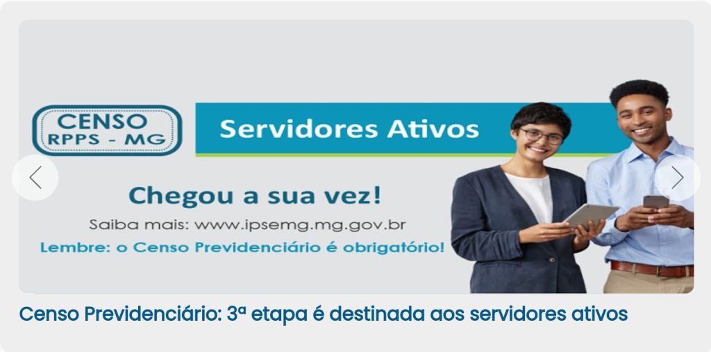 Censo Previdenciário: 3ª etapa é destinada aos servidores ativos Caros servidores ativos da PCMG, estejam atentos às datas para realização do Censo Previdenciário. A 3ª etapa será destinada aos servidores ativos. Não percam o prazo! Clique aqui !