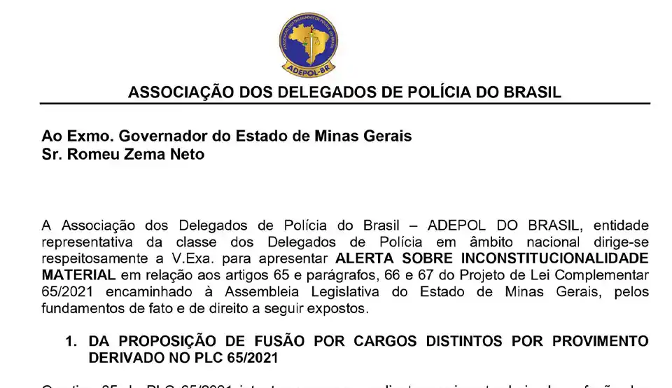 O Presidente da ADEPOL-BR, Dr. Rodolfo Laterza, encaminhou ofício ao Governador de Minas Gerais, Romeu Zema; o chefe da PCMG, Dr. Joaquim Francisco; o presidente da ALMG, Agostinho Patrus e ao Procurador-Geral de Minas Gerais, Jarbas Soares, apresentando um “alerta sobre a inconstitucionalidade material em relação aos artigos 65 e parágrafos, 66 e 67 do Projeto de Lei Complementar 65/2021 encaminhado à Assembleia Legislativa de Minas Gerais.