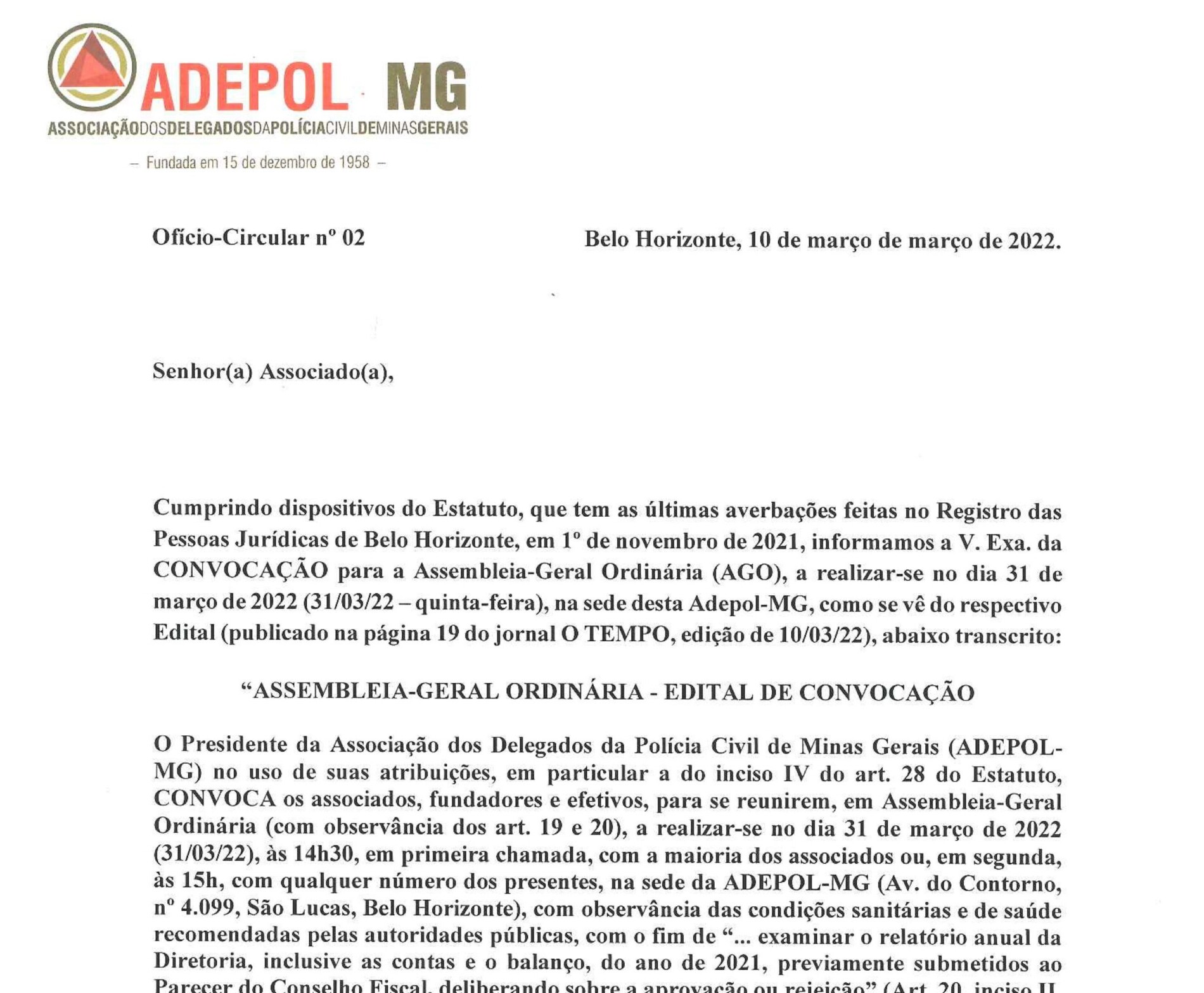 CONVOCAÇÃO PARA AGE DE PRESTAÇÃO DE CONTAS – 31/03, ÀS 14H30